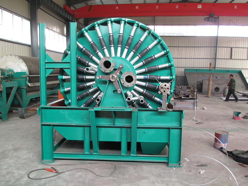 筒體內(nèi)部裝有鍶鐵氧體永久磁系,可促使磁性顆粒迅速吸附到濾布表面,由于是上部給料,使得濾餅中精礦按粒度分層的效果更加明顯,當(dāng)磁性精礦形成濾餅時,顆粒同時受到重力和磁力的作用,粗顆粒精礦比細(xì)顆粒精礦向濾布運動的快,精粒首先接觸濾布,故濾餅的透氣性好,而且礦漿中磁性顆粒在磁力吸引下呈放射狀布于圓筒表面,并由于磁系極性變化而產(chǎn)生磁攪動作用,這都成為濾餅易脫水的有利條件,使得濾餅厚且透氣性好,顯著地提高了生產(chǎn)率,與同規(guī)格的筒形真空過濾機相比,其效率提高三倍以上。